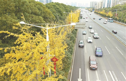11月15日,长沙市芙蓉北路开福区政府段,道路两侧的银杏树叶变得金黄,将初冬时节的道路装点得分外美丽,远远望去,犹如一条金色大道。湖南日报全媒体记者 田超 摄