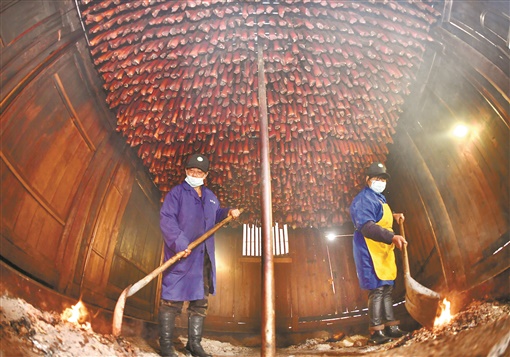 11月15日,永顺县首车镇伴湖村,湖南喜兰食品有限公司腊味熏烤房里腊味飘香。该公司以湘西土家族传统的腌制和熏烤工艺制作腊肉、腊香肠、腊鱼,通过线上线下销往全国,带动300多名村民就业增收。
