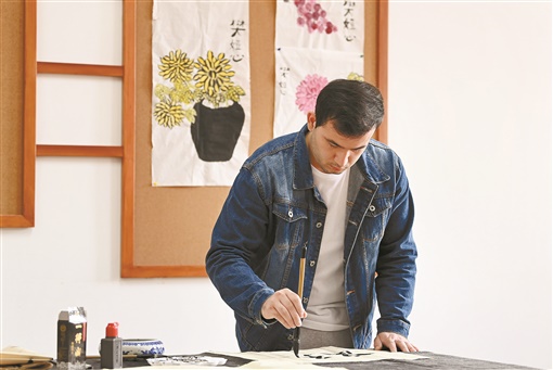 “我连说梦话都是在讲汉语。”今年24岁的侯子墨来自塔吉克斯坦,是南开大学汉语言文化学院2021级硕士生。前不久,他在2021“甲骨文杯”国际学生“我与汉字”演讲大赛中获得冠军。图为15日侯子墨在南开大学练习书法。新华社发