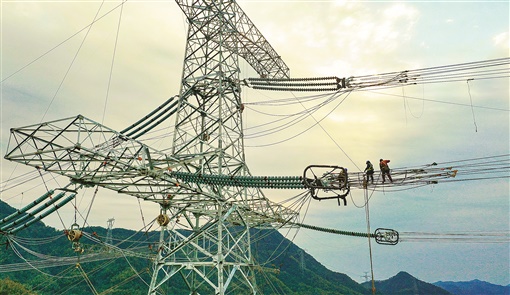 11月15日,浏阳市张坊镇张坊村,南昌—长沙1000千伏交流工程线路工程施工现场,工作人员在进行紧线施工。作为华中特高压环网的重要组成部分,该工程是国家电网公司“十四五”开局之年首条特高压交流工程,将于今年年底正式投入运行。彭红霞 摄