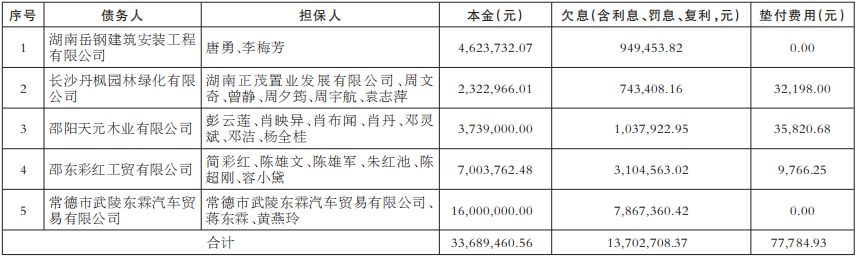 注:本公告资产清单列示贷款本息余额截至2020年6月20日,债务人和担保人应支付给湖南省财信资产管理有限公司的利息按借款合同、担保合同、法院判决及中国人民银行有关规定计算。