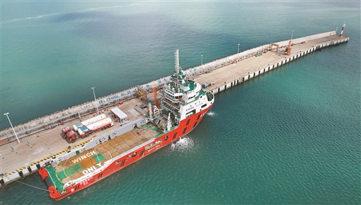 11月20日,我国首座沿海液化天然气(LNG)船舶加注站在海南省澄迈县马村港码头正式投运,由此填补了国内沿海LNG船舶加注站的空白。图为当日船舶在LNG船舶加注站加注燃料。新华社发
