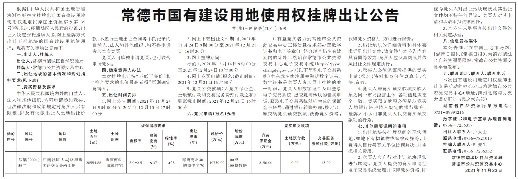 常德市国有建设用地使用权挂牌出让公告