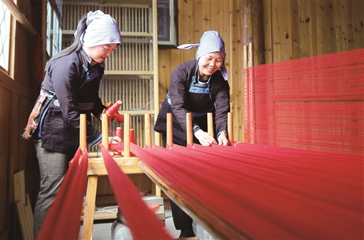 11月26日,通道侗族自治县牙屯堡镇文坡村侗锦传承基地,村民在整理侗锦纱线。近年来,该县在文坡村设立侗锦非遗传承基地,开发围巾、手袋、被套、传统侗族服饰等非遗文创产品,助力乡村振兴。
