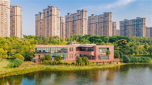在长沙市雨花区悠游小镇附近,沿着一泓清水往南,“和+”共享图书馆“身披”红瓦洒下倒影,与圭塘河轻声交谈。