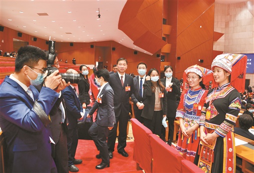 11月28日上午,大会休息间隙,省党代表、湖南日报记者辜鹏博(左一)给代表们拍照留念。 湖南日报全媒体记者 郭立亮 摄 |
