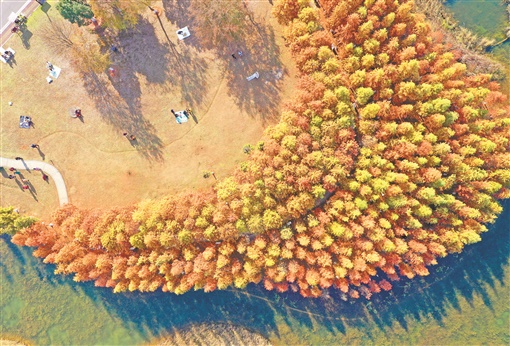 12月2日,长沙市湖南松雅湖国家湿地公园,赭红色的水杉林呈现出一幅美丽的冬日画卷,吸引了众多游客前来游玩。 湖南日报全媒体记者 李健 摄