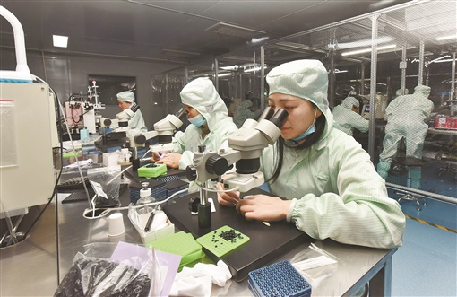 12月2日,双峰经济开发区,湖南华视光电有限公司无尘车间,工人在加工光学镜头。该公司主营生产外贸出口光学镜头,年产600万套,主要用于手机、智能穿戴、车载类镜头等行业,年产值1亿元。今年1至10月,该县实现外贸出口1.17亿美元,同比增长34%。
