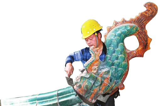 爱晚亭翘起的角梁末端装的是鳌鱼,在风吹雨打中,西南角鳌鱼尾部缺失了。施工方采用不锈钢连接断裂处,再用文物专用胶水粘合进行修缮,使得飞檐翘角恢复生机。