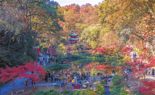古人常言,“木秀”之地可兴“文运”。作为岳麓书院师生的重要活动场所,清风峡以秋末初冬的红叶闻名,其枫香群落是享誉世界的著名森林景观之一。枫香叶片入秋经霜,幻为春红,艳丽夺目,古人称之“丹枫”。阳光下,满峡的枫香、鸡爪槭、乌桕、盐肤木等红叶植物,与金黄的银杏、刺槐,常绿的樟木等植被绘就了大片斑斓且立体的烂漫图景。