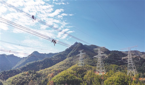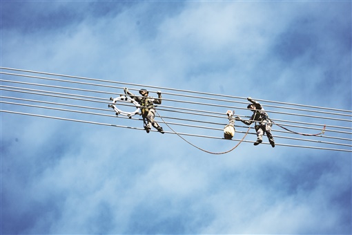12月7日,浏阳市张坊镇张坊村,南昌至长沙1000千伏特高压交流输电工程施工现场,工人在电线上安装间隔棒。该工程是雅中直流配套工程,是华中特高压交流环网的重要组成部分,将帮助湖南电网提升200万至400万千瓦供电能力,年底将投入运行。 彭红霞 摄