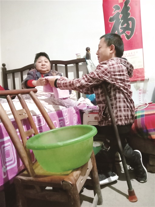 廖红(右)照顾病榻上的母亲。 通讯员 摄