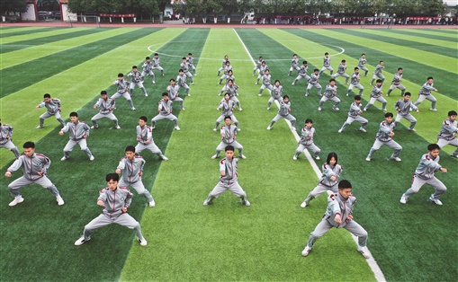 12月13日,蓝山县第二中学,学生在展示五步拳。近年来,该县在中小学校推广“体育大课间”活动,组织学生利用课间时间学习动感体操、兔子舞、五步拳等趣味运动,引导学生加强锻炼,增强体质。杨雄春 彭华 摄影报道