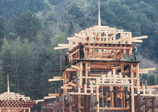 12月15日,通道侗族自治县坪坦乡皇都侗文化村,匠人在进行鼓楼建设施工。近年来,该县加大百里侗文化长廊的建设力度,展示民族建筑特色,传承侗族文化。 尹序平 摄