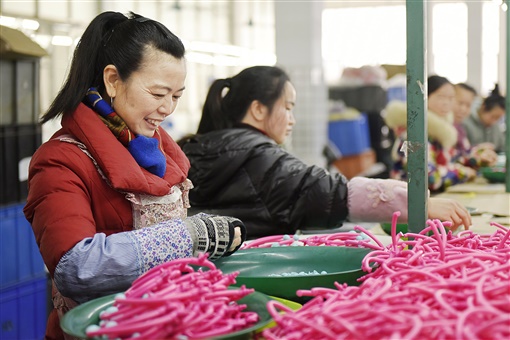 12月22日,蓝山县毛俊镇毛俊村三哥玩具厂,村民在加工玩具配件。近年,该县引导园区规模企业与村支两委合作,将村里的闲置房屋改造为皮具玩具等加工厂。目前,该县兴办乡村工厂150多家,吸纳劳动力就业3000多人,有效促进村民在家门口就业增收。