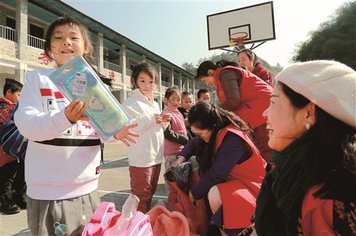 12月21日,通道侗族自治县溪口镇杉木桥小学,爱心志愿者在给贫困学生发放学习用品、冬季运动服及慰问金。当天,怀化市教育局、怀化市志愿者协会的爱心志愿者们来到该校组织开展公益助学捐赠活动,为边远山区的贫困学生送来了爱心与祝福。 刘强 石俊 摄影报道