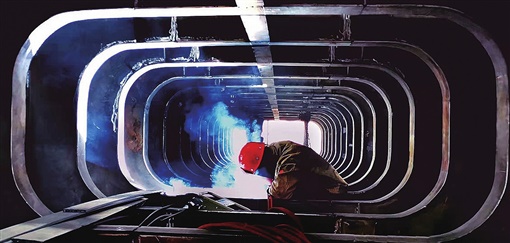 吊装机挥舞臂膀,吊装着各式设备。每个工位上,工人们有条不紊地忙碌着,焊光频闪,敲击声声。