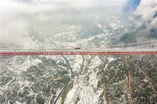 12月28日,车辆行驶在吉首市矮寨特大悬索桥上。近日,该市迎来降雪,矮寨特大悬索桥与皑皑白雪相互辉映,美丽壮观。 刘振军 摄