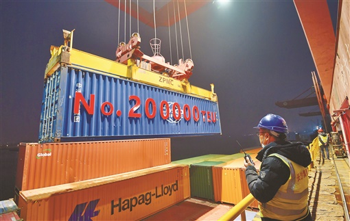 12月28日18时8分,长沙新港,一个标有“NO.200000TEU”字样的集装箱装船待发。至此,长沙新港集装箱年吞吐量首破20万标箱,创造了长沙港发展史上新的“里程碑”,标志着长沙新港进入我国内河支线港口领先行列。