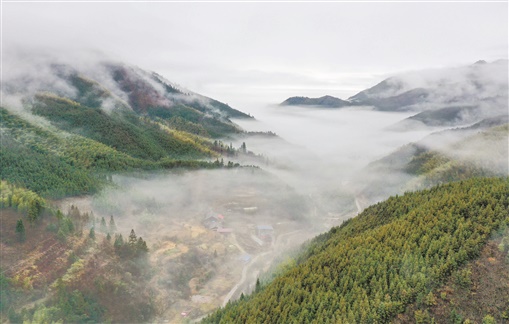 12月29日,道县洪塘营瑶族乡东江源村,群山、乡村和村道在云雾中若隐若现,宛如一幅水墨画卷。蒋克青 摄