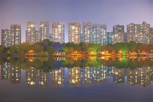 12月29日,长沙月湖公园,万家灯火倒映在水面上,与夜色浑然一体,别样迷人。