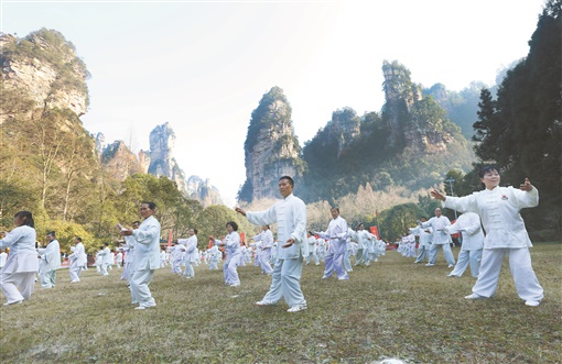 1月1日,张家界核心景区武陵源,200多名太极拳爱好者进行太极拳展演,在峰林美景间享受健身乐趣。吴勇兵 摄