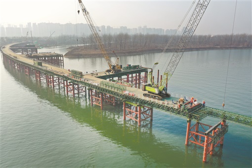 1月2日,中交一公局长益复线至兴联路大通道工程(过江段)项目,施工人员放弃假日休息,加紧搭建河西段栈桥。该项目跨湘江段主桥双向八车道,是湖南省单体最大的市政桥梁项目,主桥临时施工通道——钢栈桥长932米。目前钢栈桥建设加速推进,预计3月底完成栈桥施工任务,为桥梁后续的主体建设打下坚实基础。湖南日报全媒体记者 田超 摄