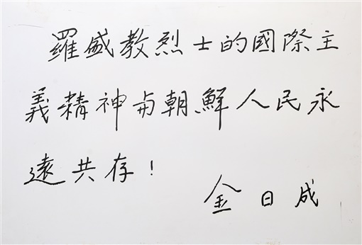 村民们将罗盛教的“烈士服”脱了下来,用温水给罗盛教洗脸,一位阿妈妮又用自己结婚时珍藏起来的胭脂和唇膏,给罗盛教化妆,让他的脸色好看一点。小学生们则从佛体洞山上采来青青的松枝叶,铺在拼起的课桌上给罗盛教作为灵床……这是朝鲜人民在表达对逝者的最高敬意!