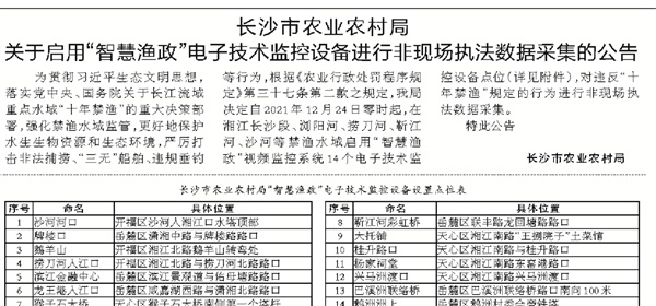 长沙市农业农村局 关于启用“智慧渔政”电子技术监控设备进行非现场执法数据采集的公告