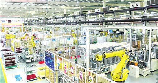 这个从2021年1月启建、7月便建成投产的项目,如今已形成月产6万套电动总成的生产能力,全面配套比亚迪汽车所有DM-i车型。走进车间,5条生产线同步开工,机械臂上下挥舞,取、夹、放、焊一气呵成,每3分钟便能下线一台电机。
