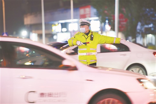 ▲ 1月10日晚,长沙市芙蓉区五一大道与蔡锷中路交叉路口,交警在车流中执勤。当天是第二个中国人民警察节,长沙市各警种人民警察履行职责,在岗位上度过自己的节日。湖南日报全媒体记者 辜鹏博 摄