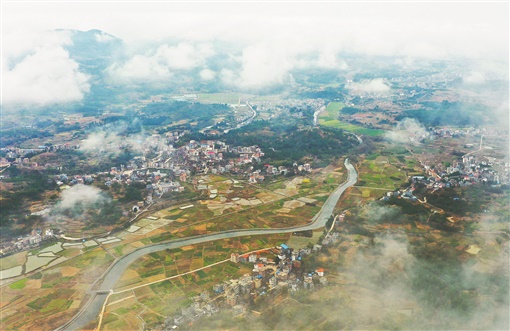 1月8日,新田县中山街道东升村,青山、田园、河流和村庄在云雾中若隐若现,宛如人间仙境。近年,该村加大生态环境保护力度,积极推进美丽乡村建设,先后获评湖南省美丽乡村建设示范村、国家森林乡村、湖南省级乡村振兴示范创建村。刘贵雄 摄