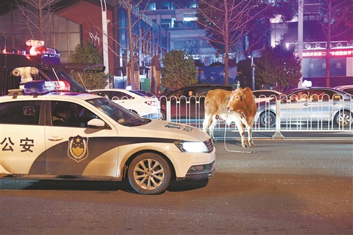 1月11日晚11时许,长沙市芙蓉中路湘雅医院路段,一头黄牛从货车上掉落到马路上,“悠闲”地在道路中间“散步”,迫使过往司机纷纷避让。长沙市公安局特巡警支队和湘雅路派出所民警及时出警处置,将黄牛送上货车,消除了一起道路交通安全隐患。湖南日报全媒体记者 辜鹏博 童迪 摄影报道