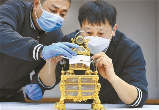 小心又小心。第一件现身的文物是金光闪闪的嵌宝石琴钟,因为它非常地精细,所以包装也很讲究。省古器物研究展示中心主任、“欧洲盛宴”展策展人方昭远用“严丝合缝”形容这件琴钟的包装,工作人员拆除时非常谨慎。