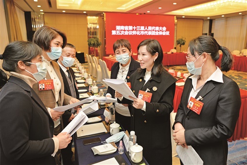 1月17日,怀化市代表团分组讨论间隙,代表们结合各自工作实际,交流意见和建议。