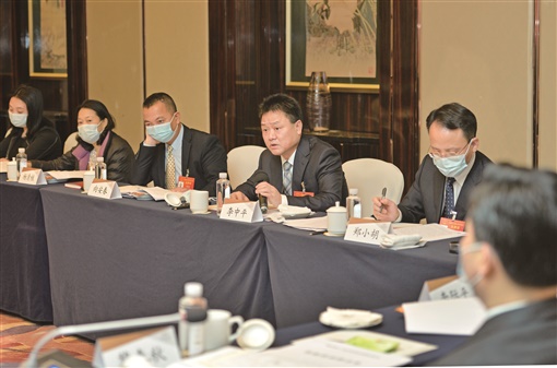 1月18日上午,怀化市代表团代表李中平(左四)在分组讨论会上就加快有色金属产业高质量发展建言。