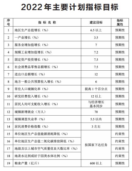 主要计划目标:地区生产总值增长6.5%以上,规模工业增加值增长7.2%,固定资产投资增长7.5%,社会消费品零售总额增长7.5%,进出口增长12%,地方一般公共预算收入增长6%,居民消费价格涨幅3%左右,城镇新增就业70万人,城镇调查失业率5.5%以内,居民收入增长与经济增长基本同步,粮食产量600亿斤以上,生态环境质量持续改善。