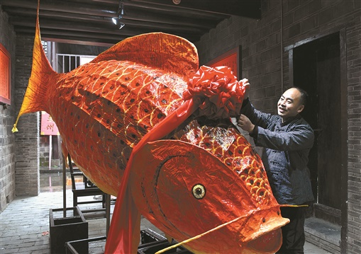 1月24日,吉首市乾州古城,滕勇在为刚完成的作品《喜庆有余》披彩。农历虎年临近,纸扎艺人滕勇用传统纸扎手工艺创作纸扎作品金虎、金鱼、金牛等吉祥物,为新春佳节添彩。