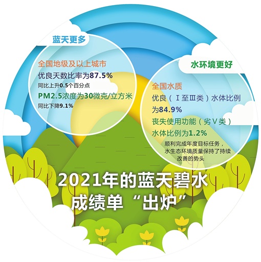 记者从生态环境部获悉,2021年,国民经济和社会发展计划中生态环境领域8项约束性指标顺利完成,污染物排放持续下降,生态环境质量持续改善。生态环境保护实现“十四五”起步之年良好开局,交出亮眼成绩单。新华社发