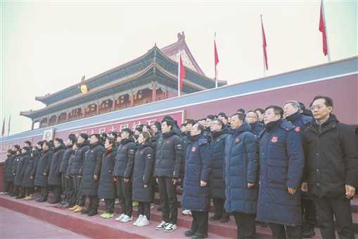 25日,北京冬奥会中国体育代表团部分成员在天安门广场观看升国旗仪式并宣誓出征。新华社发