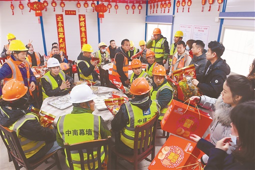 1月26日,南方农历小年,湖南三一(韶山)风力发电机叶片生产园区建设项目工地大食堂,工友开心参加由中建二局湖南分公司举办的“春暖农民工”活动,工会为工友精心准备了新春大礼包,职工志愿者和工友们一同包饺子、写春联,年味十足。