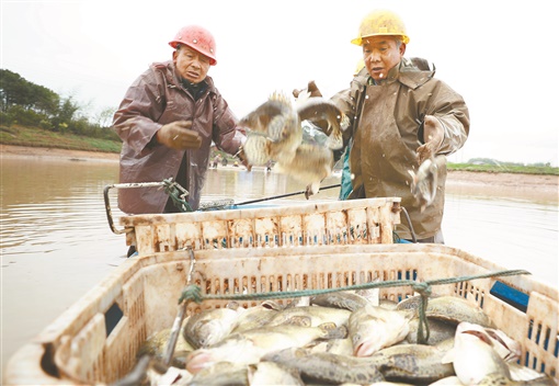 上图:1月27日,衡阳市蒸湘区呆鹰岭镇土桥村,村民将鳜鱼装车外运。