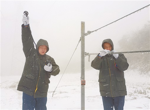 1月29日,浏阳市蕉溪岭山顶,国网浏阳市供电公司防冻融冰监视哨值班人员正在风雪中值守检测冰情。该哨位于海拔400米高的山顶,因处于两山之间的风口,在低温雨雪天气线路极易覆冰。曾舸 摄