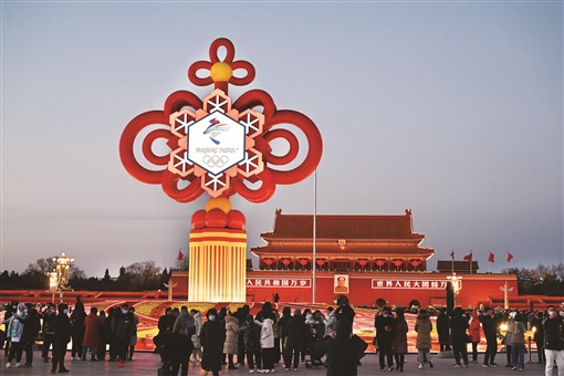 2月3日傍晚,北京市天安门广场,许多市民、游客被喜庆的巨型“冬奥中国结”场景吸引,纷纷驻足拍照。