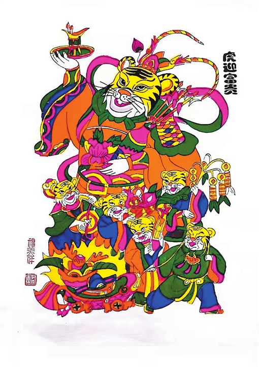 作为滩头创新年画“十二生肖·五子登科”系列之一,《虎迎富贵》严谨继承滩头年画的造型特征,并赋予其新时代的审美趣味。《虎迎富贵》由一只身穿帅服、头戴小花翎的大虎与五只活泼可爱的小虎组成。画中,大虎一手抱瓶,瓶插三戟,虎虎生威。五只小虎动态不一,虎头虎脑,憨掬可爱。整体构图饱满生动,色彩艳丽,造型喜人。