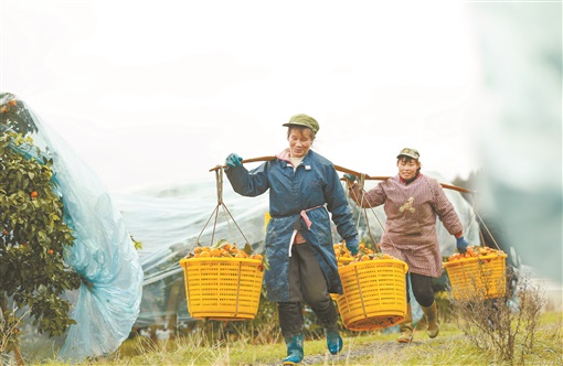 2月11日,通道侗族自治县万佛山镇更头村,村民在采收、搬运砂糖橘。近年,该县依托地理环境优势,瞄准粤港澳大湾区精品水果市场需求,打造山区优质水果产业集群,带动村民增收致富。