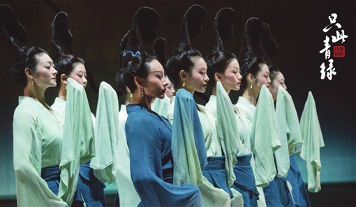 《只此青绿》中,编导巧妙地抓住《千里江山图》画卷中,烟波浩渺的江河、层峦起伏的群山的韵律与舞蹈有共通之处的特点。舞者们姿势各异地站立,最终融为了一片青绿色的山峦。在徐徐展开的画卷下,山峦走势变化、云雾虚无缥缈,舞者们身着青绿服饰,头绾山峦状发饰,同样顺势变化,或动或静,或立或倾,或群立或散开,整齐划一又快捷如风,散落四野又轻曼似歌,配上美妙音乐,生动还原《千里江山图》。