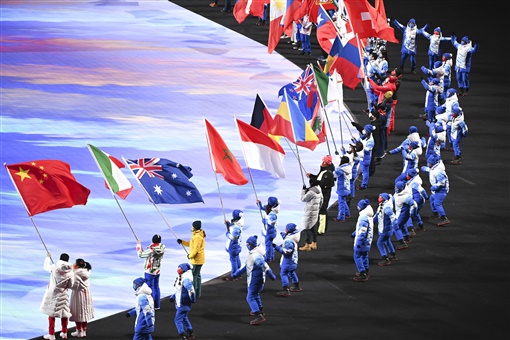 当12只生肖冰鞋滑载起孩子们旋转飞舞,天地瞬间变为一方欢乐热烈的梦幻冰场。闭幕式导演沙晓岚介绍,冰鞋在地屏上留下的“痕迹”逐渐形成一个“中国结”形状。与此同时,由AR(增强现实)技术生成的美丽红线,在天空上优雅生长,编织成一个巨大的中国结包裹雪花火炬,与地面影像交相辉映。“运动员挥舞五彩斑斓的参赛代表团旗帜,在‘中国结’线条的包裹中入场,世界各国之间的连接和大同在这一刻彰显无遗。”