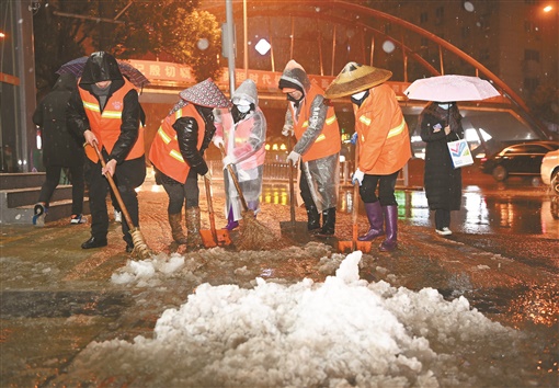 上图:2月22日,长沙市锦泰广场周边,环卫工人在清扫路面积雪。