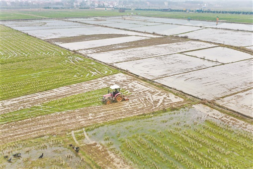 上图:2月24日,蓝山县塔峰镇六七甲村,农民驾驶拖拉机在犁田。近年,该县通过土地流转、培育种粮大户等方式,稳定粮食种植面积,严守耕地保护红线。